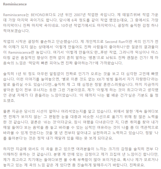테일즈위버는 처음 부분에 잠깐 언급했다시피 게임은 잘 몰라도 BGM은 모르는 사람이 없을 정도로 배경음악이 굉장히 뛰어난 편입니다. 테일즈위버는 리듬 게임도 아님에도 불구하고 음악으로 이름을 날리게 되는 위업을 달성했죠. 그렇기 때문에 인터넷에서 우연히 음악을 먼저 접하고, 이후 음악이 마음에 들어 게임에 입문하게 된 유저들도 꽤나 있죠. 또한 현재 게임의 인기는 다른 재미있는 게임들이 많이 나오며 크게 줄었으나 간간히 배경음악을 들으러 오는 사람도 있다고 합니다. 테일즈위버의 대표적인 배경음악으로는 이번에 소개해드린 Reminiscence와 또 다른 같은 작곡가의 곡인 Second Run이라는 곡이 있는데요, Second Run역시 조만간 포스팅을 해볼 예정입니다. 여하튼 이번 포스팅은 여기서 마무리하도록 하고 다음번에는 또 다른 포스팅으로 다시 찾아오도록 하겠습니다. 🙂