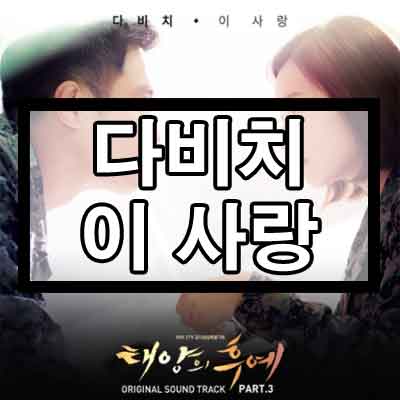 이번에 소개해드릴 곡은 태양의 후예 OST곡인 다비치의 이 사랑입니다. 저는 드라마 태양의 후예는 안봤지만 그럼에도 노래들은 거리에서 자꾸 들려서, 그리고 좋아서 자주 들었었던 기억이 있네요. 특히 OST곡들이 한 두개가 아니라 많은 곡들이 있는데 그중에서도 다비치의 이 사랑을 특히 좋아합니다. 뭔가 서정적이라고 할까요? 하여튼 한번 들어보도록 하겠습니다.