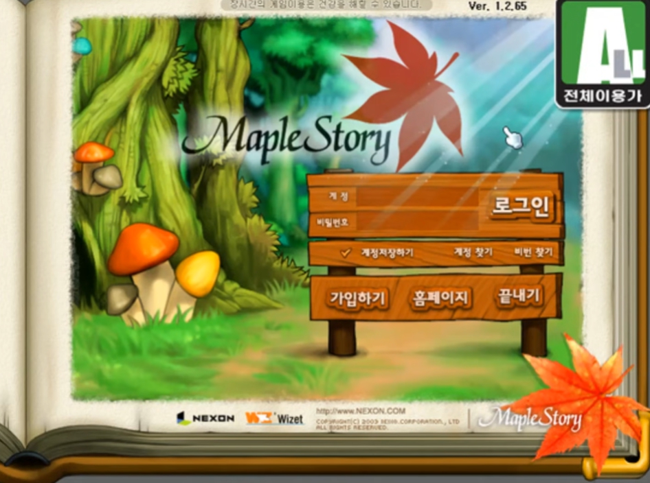 과거에는 홈페이지에서 로그인을 하고 게임 시작을 누르는 버튼이 아닌, 메이플스토리 실행 파일을 키면 위와 같이 게임이 켜지고, 게임 안에서 로그인을 하는 방식이었습니다. 그와 함께 나오는 메이플스토리 로그인 화면 브금은 잔잔하면서도 한 번쯤 과거 메이플스토리를 플레이해본 사람들에겐 추억에 젖어 감성적이게 만들죠.