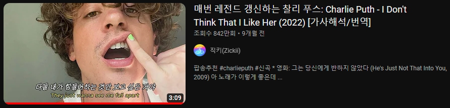 가운데 재생 버튼을 누르면 찰리 푸스(Charlie Puth) – I Don’t Think That I Like Her가 재생되며 영어 가사 및 해석의 경우 아래에 따로 작성해두었으니 필요하신 분은 스크롤을 내려 참고해주시면 되겠습니다.